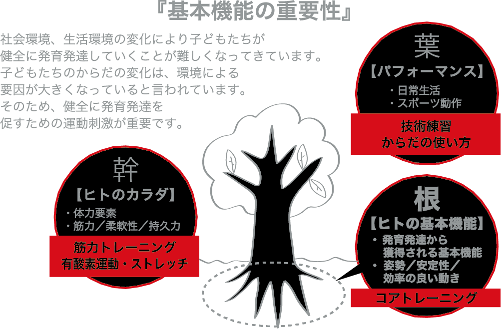 からだの土台とは、「いい姿勢」と「スムーズな動き」のことで、スポーツパフォーマンスに必要な要素です。発育発達から獲得される基本機能である姿勢の安定性や効率の良い動きを適した時期に、コアトレーニングを通して土台作りを行うことで運動能力やスキルが高まり、ケガをしにくい身体が育つなど様々な良い効果を得ることができます。