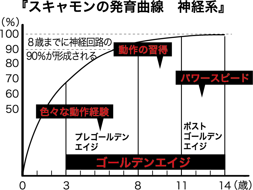 9歳〜13歳は「ゴールデンエイジ」と呼ばれ、神経回路の形成はほぼ100%になるため、動きの習得に最も適した時期となる。自分が思ったようにからだを動かせるようになる時期。この時期に覚えた技術は大人になってもずっと身についていると言われます。
